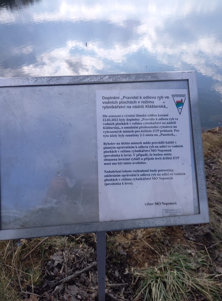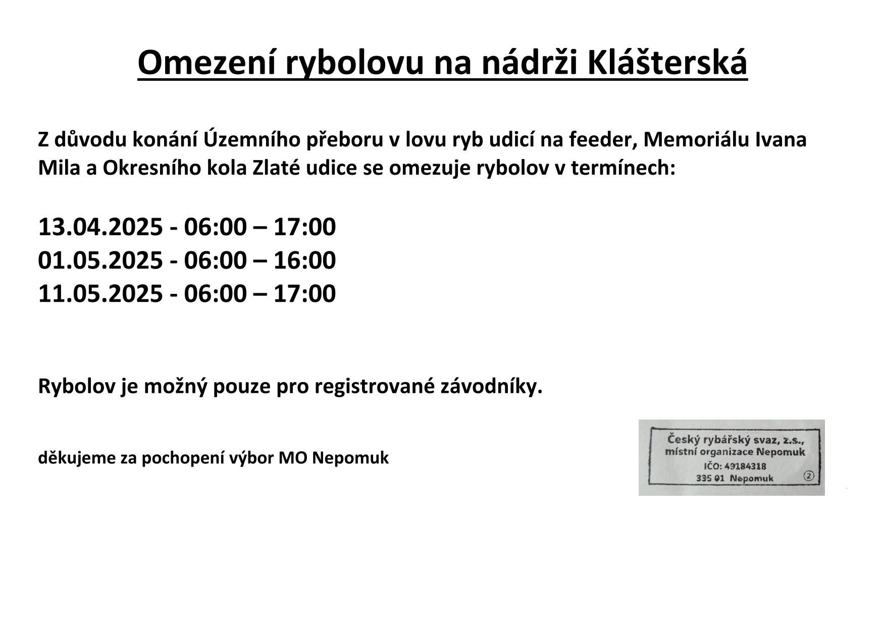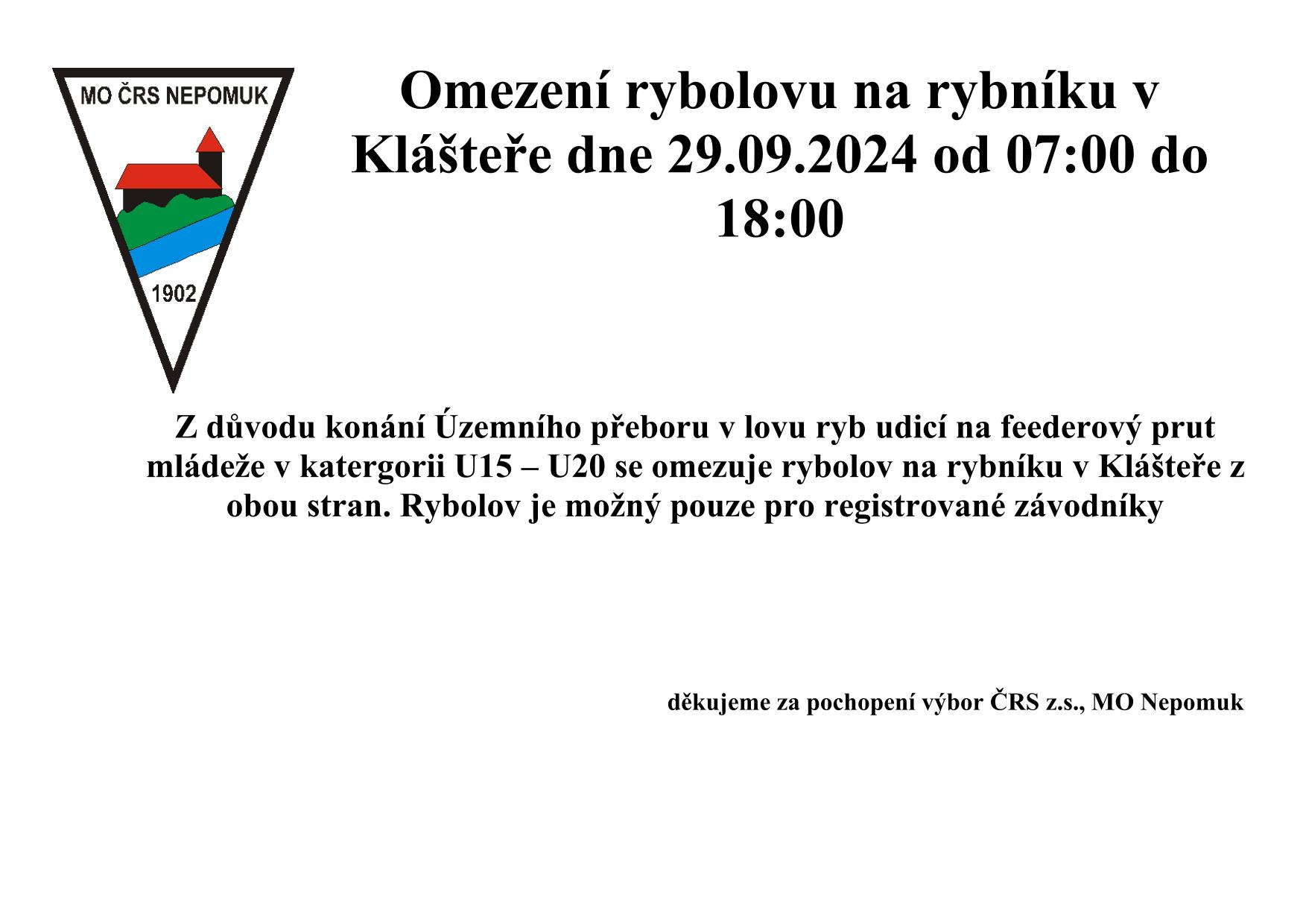 Z důvodu konání Územního přeboru v lovu ryb udicí na feederový prut mládeže v katergorii U15 – U20 se omezuje rybolov na rybníku v Klášteře z obou stran. Rybolov je možný pouze pro registrované závodníky.