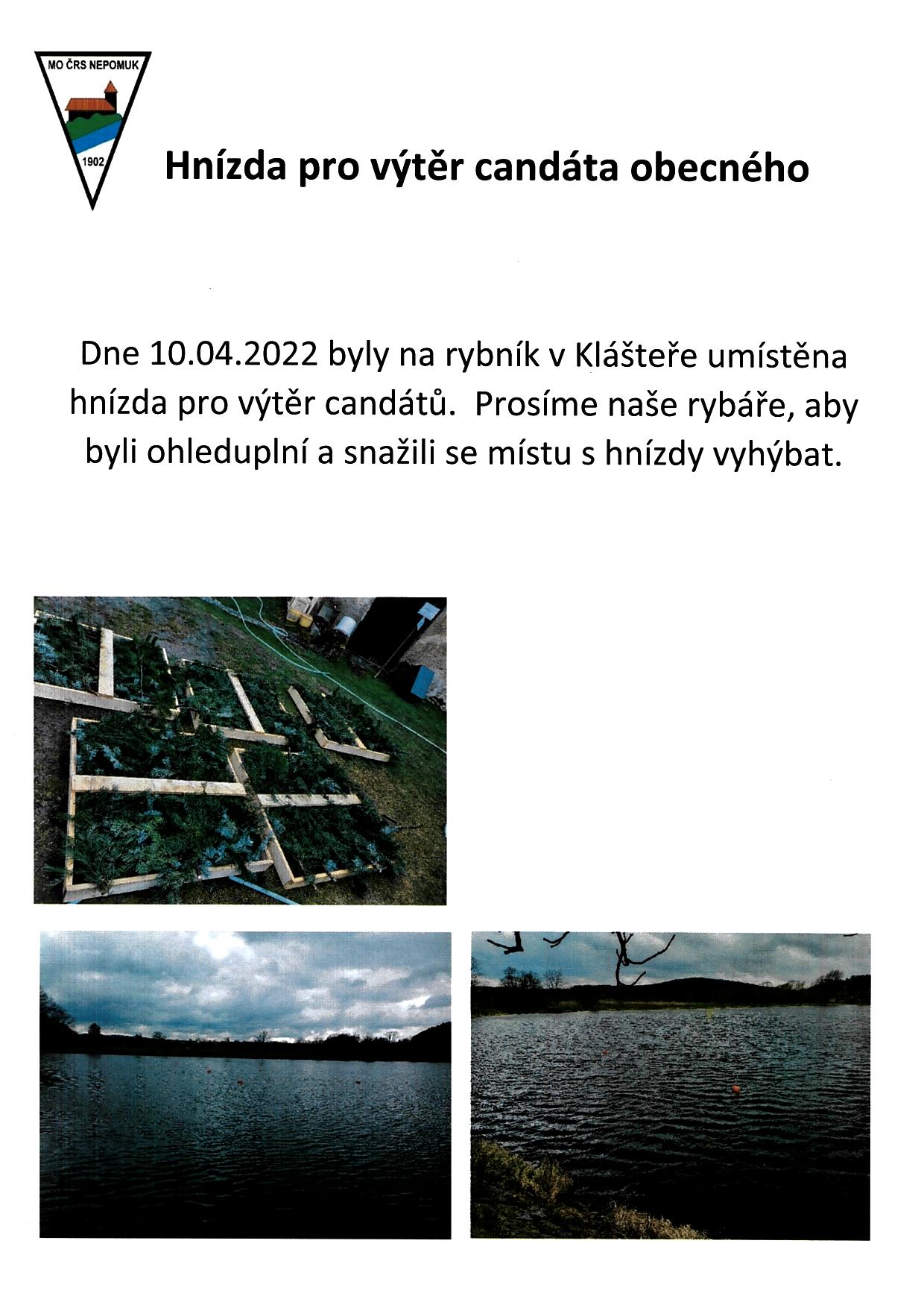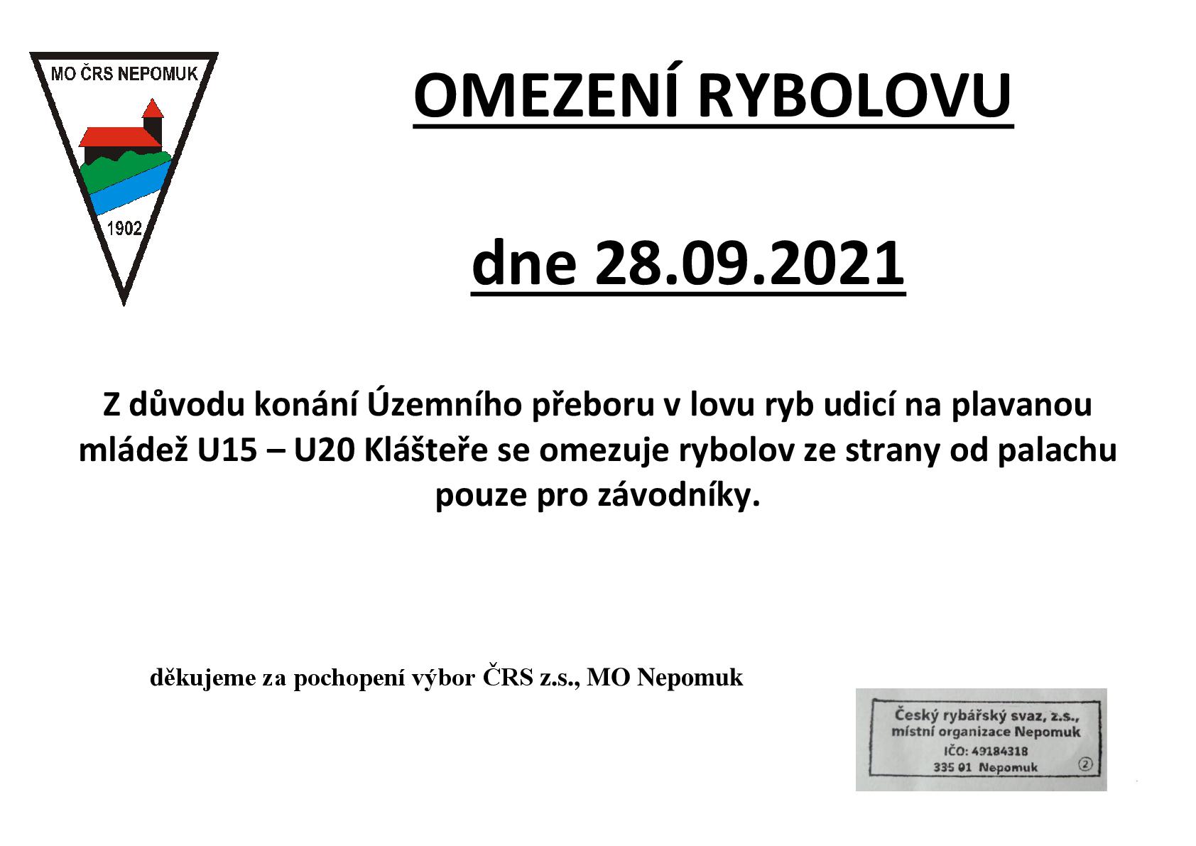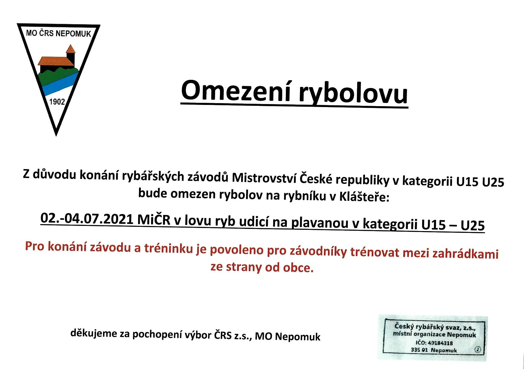 Z důvodu konání Územního přeboru v lovu ryb udicí na feederový prut mládeže v katergorii U15 – U20 se omezuje rybolov na rybníku v Klášteře z obou stran. Rybolov je možný pouze pro registrované závodníky.