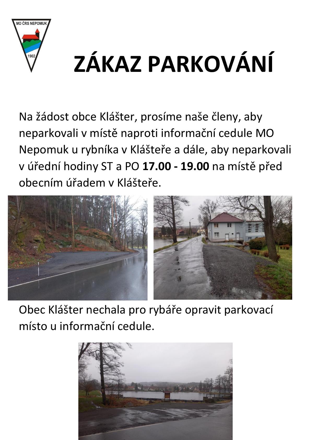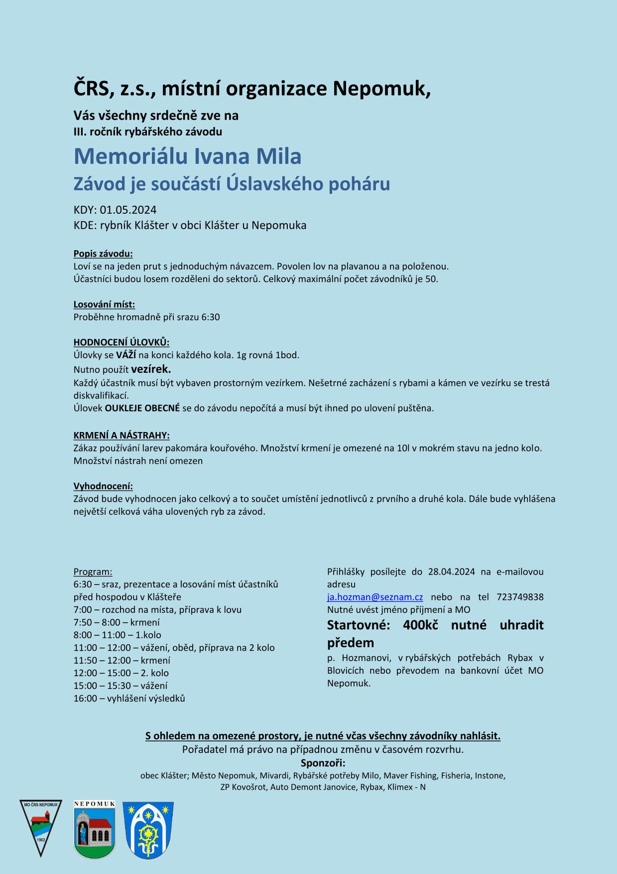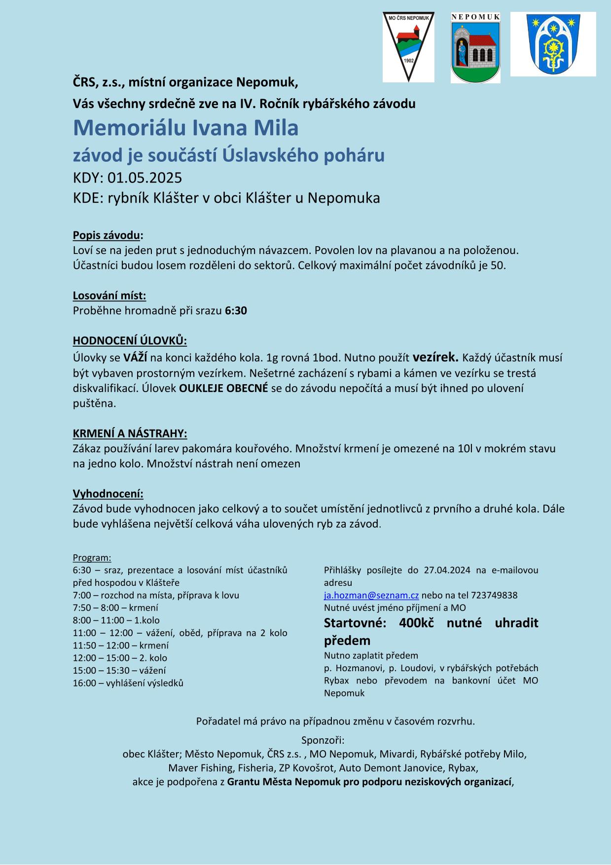 Z důvodu konání Poháru pod Zelenou horou se omezuje rybolov na rybníku v Klášteře z obou stran Rybolov je možný pouze pro registrované závodníky.děkujeme za pochopení výbor ČRS z.s., MO Nepomuk