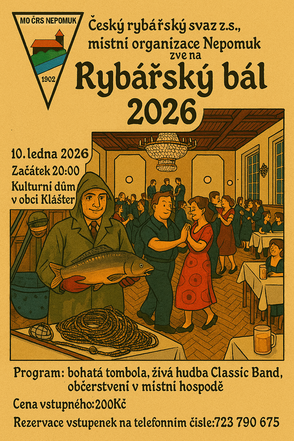Pro členy Českého rybářského svazu z.s., místní organizace Nepomuk je možné odevzdat úlovkové listy (povolenky) 03.01.2026 kdy bude probíhat první termín s možností výdeje nové povolenky a platby členských příspěvků v restauraci Sokolovna v Nepomuku od 10:00 - 15:30.